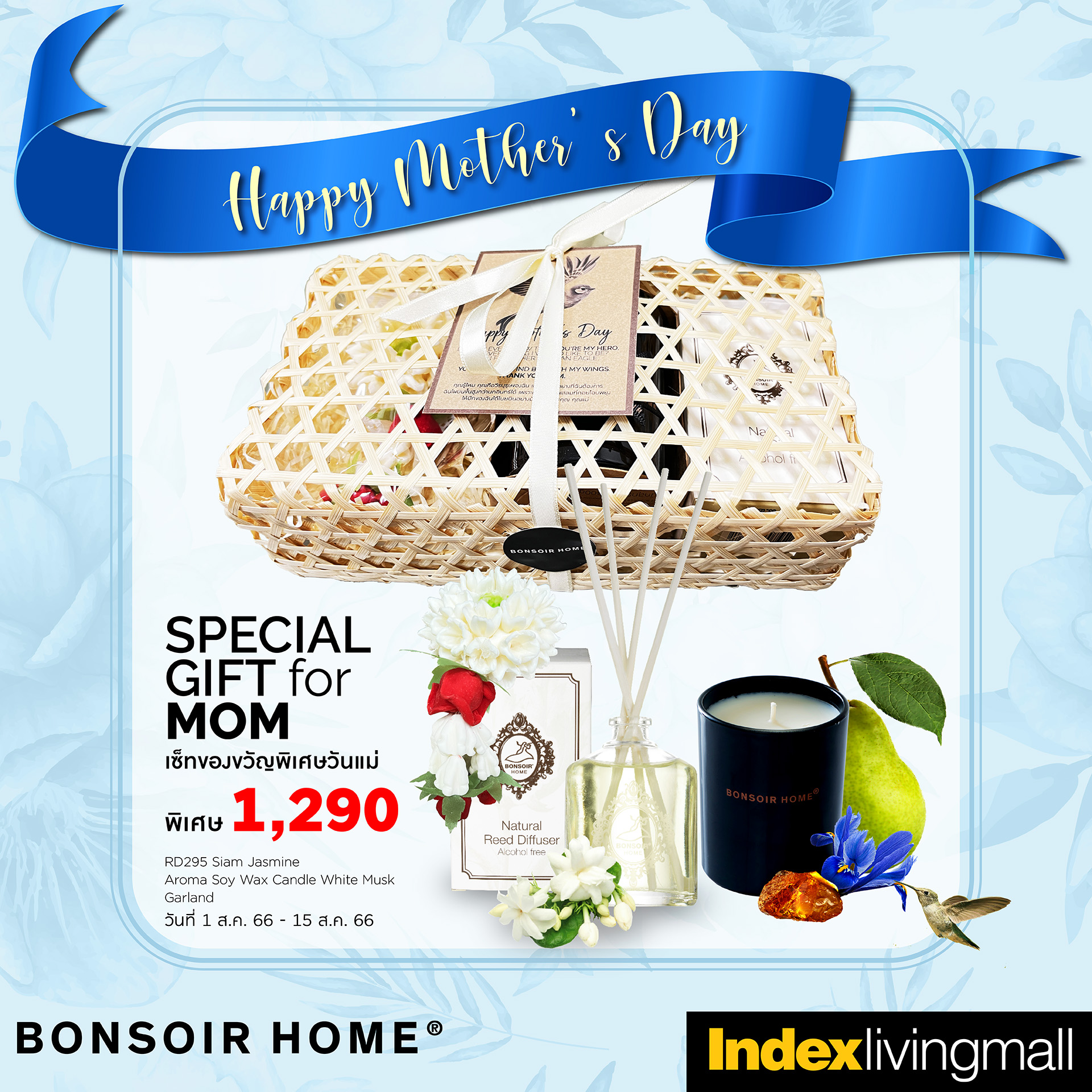 BONSOIR HOME และ INDEX LIVING MALL ขอเป็นตัวแทนส่งมอบความรักจากคุณลูกสู่คุณแม่ด้วยเซ็ทของขวัญสุดพิเศษ Specaial Gift for Mom ในราคาพิเศษ 1,290 บาท ประกอบด้วย น้ำหอมปรับอากาศภายในบ้านกลิ่น Siam Jasmine เทียนหอมไขถั่วเหลือง กลิ่น White Musk และความอบอุ่นซึ้งใจขึ้นอีกกับพวงมาลัยพวงน้อยน่ารัก ให้คุณลูกได้กราบคุณแม่ เพื่อเป็นสิริมงคล และเป็นสายใยรักระหว่างกันตราบนานแสนนาน